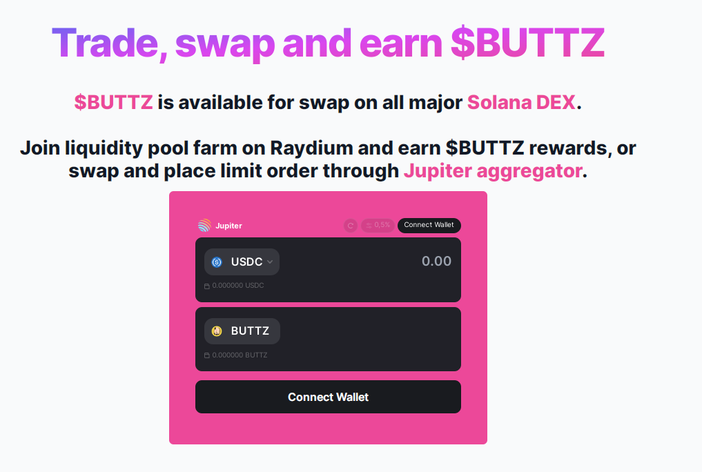 $BUTTZ is integrated for trading on all major Solana DEX, with the purpose to offer different solutions for liquidity providing or buy/sell/stake/farm the token.