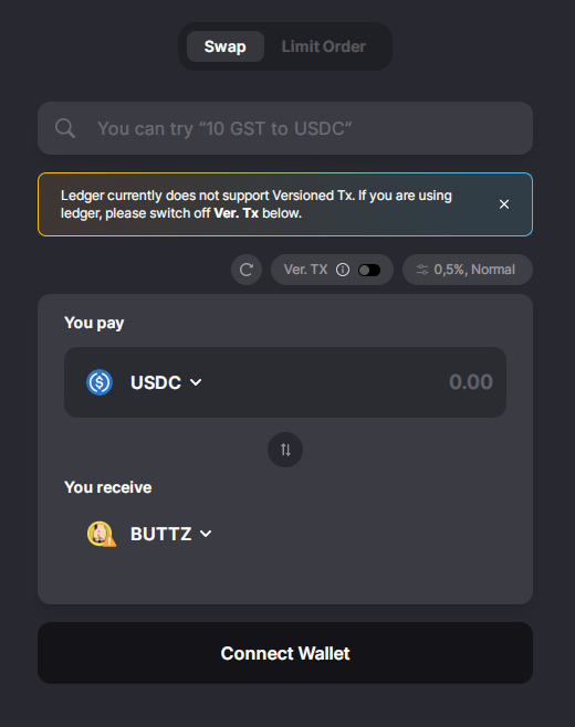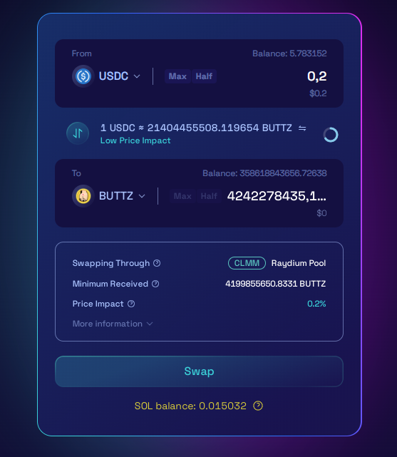 #### You can complete traditional swaps on [Raydium](https://raydium.io/swap?inputCurrency=EPjFWdd5AufqSSqeM2qN1xzybapC8G4wEGGkZwyTDt1v\&outputCurrency=ButtzRVXEyHU8oxQmrUEpcTyE7qR9zGtyr43AVkYnuKK) according to following procedure.